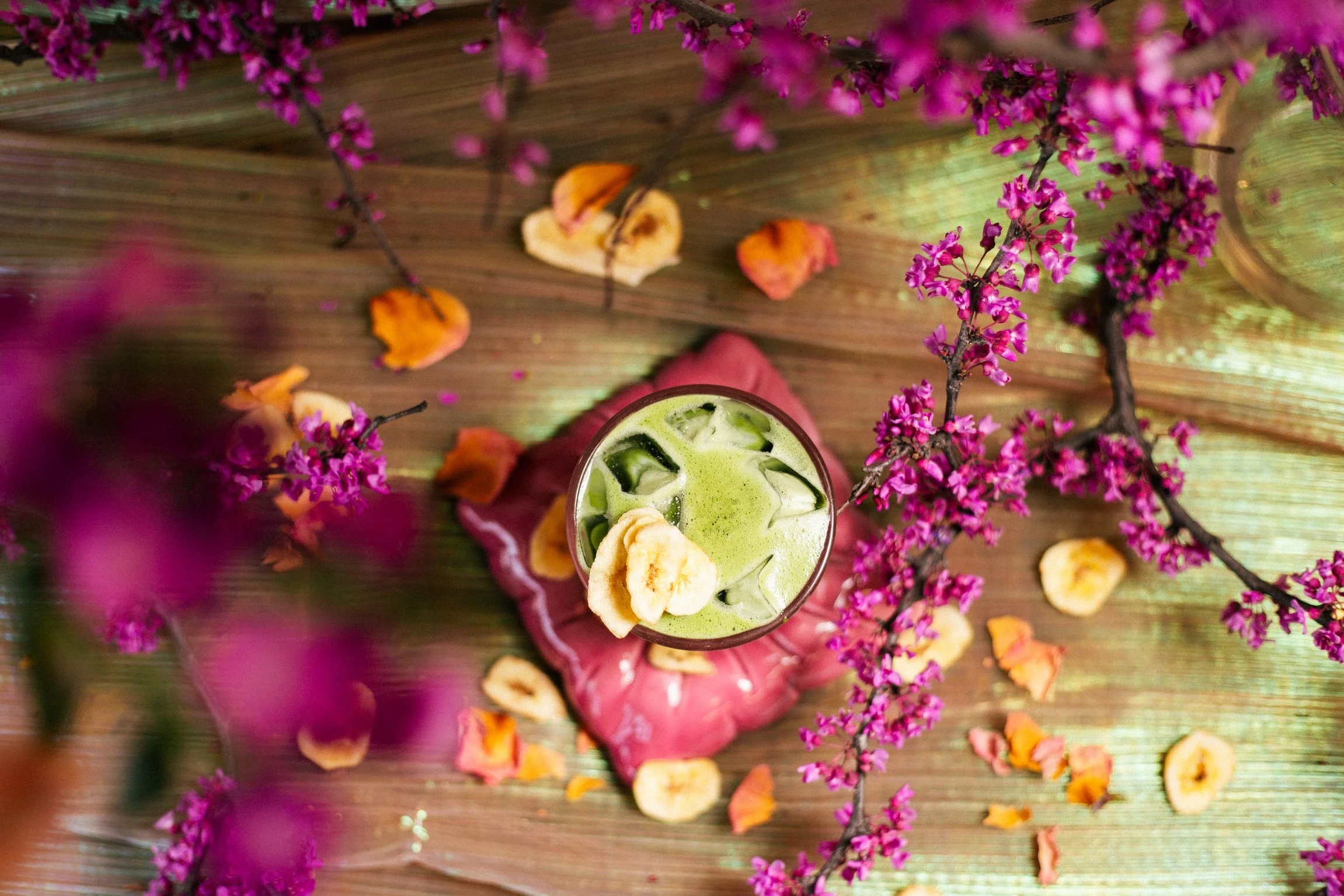 housemade banana syrup with a hint of rose + matcha + oat milk // hot or iced